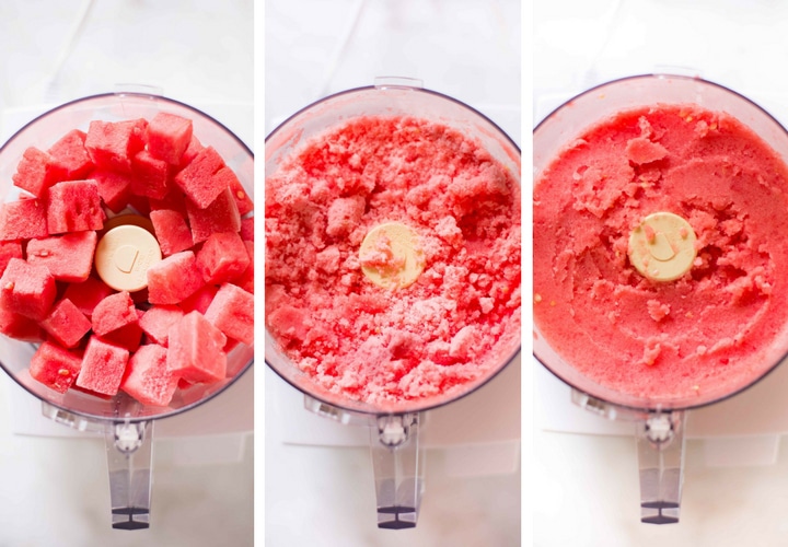 – Στη συνέχεια, κόβουμε το καρπούζι σε μικρά κομμάτια και έπειτα τα βάζουμε στο μπλέντερ μαζί με το σιρόπι και τον χυμό λεμονιού. Χτυπάμε τα υλικά μέχρι το μείγμα να έχει κρεμώδη υφή.