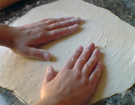 – Μόλις ετοιμαστεί η ζύμη, την χωρίζουμεσε δυο μέρη. Το κάτω φύλλο πρέπει να είναι παραπάνω από το πάνω φύλλο. Αφού αλευρώσουμε τον παγκο μας «ανοίγουμε» τα φύλλα μας.