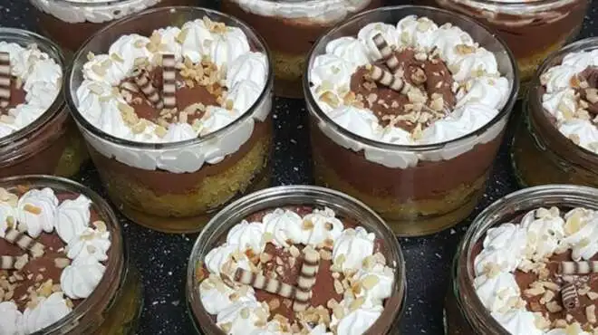 - Χτυπάμε στο μίξερ την στιγμιαία κρέμα σοκολάτας Γιώτης και βάζουμε μία στρώση περίπου 2 με 3 δάχτυλα στο ποτήρι.