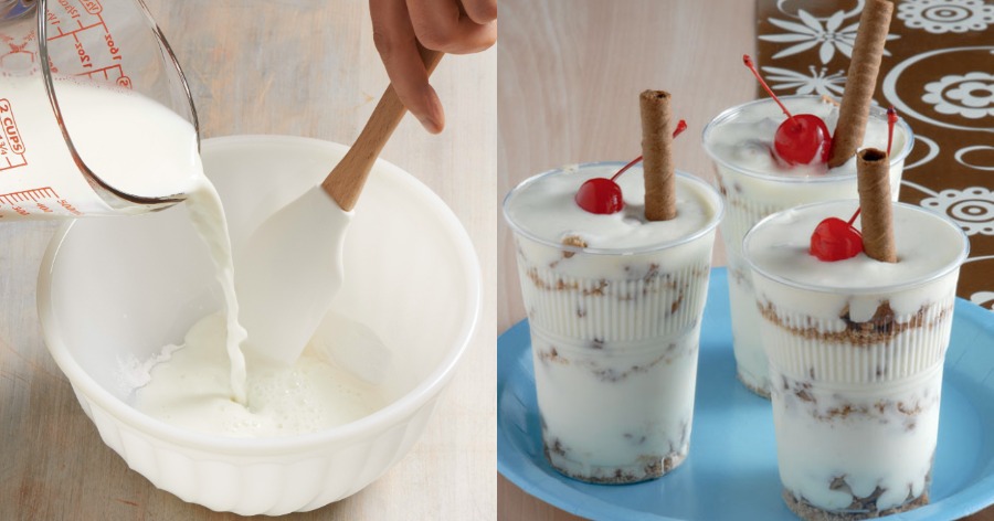 – Χτυπάμε το γιαούρτι και το γάλα με τον αβγοδάρτη.