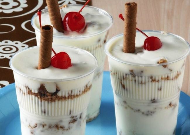 – Επαναλαμβάνουμε τη διαδικασία με στρώσεις από μπισκότα και κρέμα. Το κάνουμε έως ότου να γεμίσουν τα ποτήρια μας.