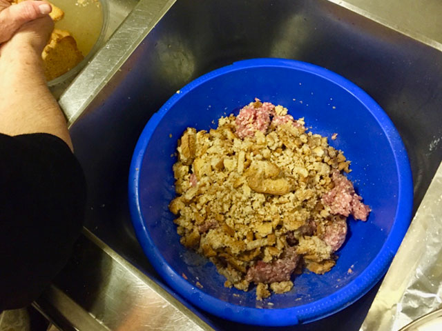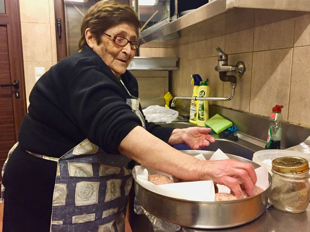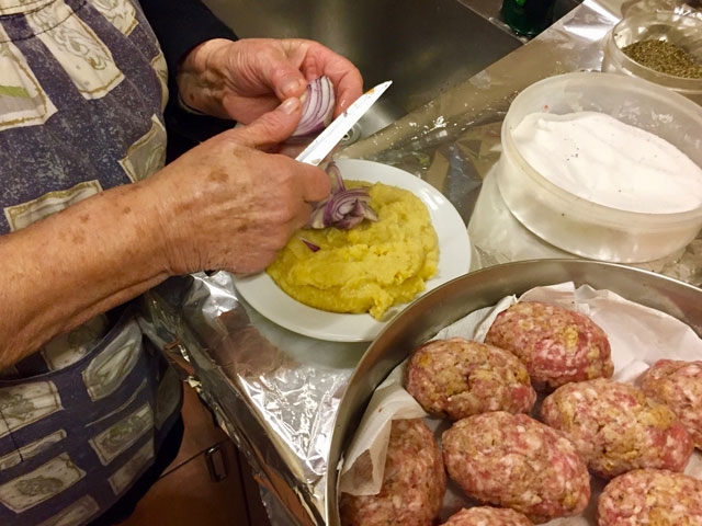 Σ’ ένα στενόμακρο κουζινάκι, μέσα σε μια μεγάλη λεκάνη ζυμώνει δυνατά σαν άντρας, πλάθει ανάλαφρα σαν παιδί και μοιράζεται τα μυστικά της απλόχερα σαν έμπειρη νοικοκυρά. Ανάμικτος ελληνικός κιμάς, βρεγμένη φρυγανιά, αλάτι, μυρωδικά και λίγο ξύδι. Αυτά είναι όλα κι όλα, μου λέει. “Αλλά είναι και το καλό χέρι παιδί μου μαζί με τα διαλεχτά υλικά. Να φας καθαρά και νόστιμα. Αυτό μετράει. Όχι τηγανόλαδα και ξένα κρέατα”.