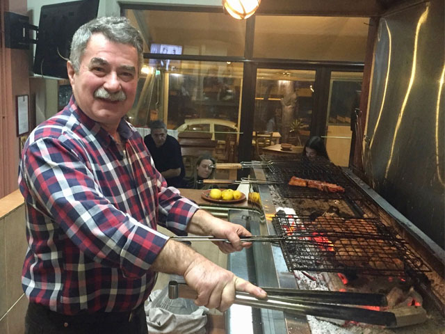 “Με λόγια δεν περιγράφεται η μάνα μου. Αν την ακολουθήσεις μια μέρα, θα πέσεις κάτω. Εμάς μας έχει βάλει τα γυαλιά, αγάπη μου“. Ο «επίσημος» ψήστης, είναι ο γαμπρός της Κυρά-Ουρανίας, ο άντρας της κόρης της -της Σοφίας δηλαδή- που είναι πλέον και η ιδιοκτήτρια της ταβέρνας. Ευγενικός και χαμογελαστός πίσω από το μουστάκι του. Ο κύριος Γιώργος ψήνει με μαεστρία και συζητάει επί παντός επιστητού. Όσο περνάει η ώρα, γύρω από τον πάγκο της ψησταριάς μαζεύονται οι μυημένοι πελάτες και φίλοι πλέον της οικογένειας. Περιμένουν να πάρουν τα κρεατικά τους πακέτο για το σπίτι, σύνηθες φαινόμενο για το μαγαζί. Πίνουν όλοι μαζί κρασί, τσιμπάνε νοστιμιές, γελάνε.