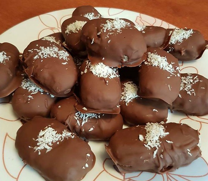 Στη συνέχεια, λιώνετε την σοκολάτα σε Μπεν Μαρί, βγάζετε την καρύδα από την κατάψυξη και τα βουτάτε.