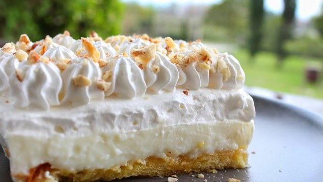 – Χτυπάμε την κρέμα γάλακτος σε σαντιγί και την απλώνουμε πάνω στο γλυκό.