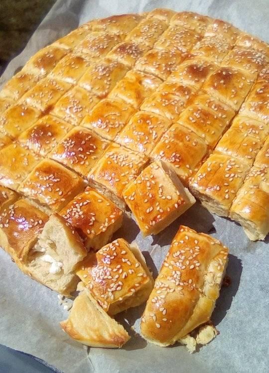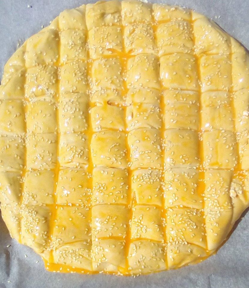 – Το χαράζουμε σε μικρά κομματάκια. Περιχύνουμε την πίτα με χτυπημένο κρόκο αραιωμένο με γάλα φρέσκο. Πασπαλίζουμε με σουσάμι και την ψήνουμε στους 180 βαθμούς μέχρι να πάρει ωραίο χρώμα