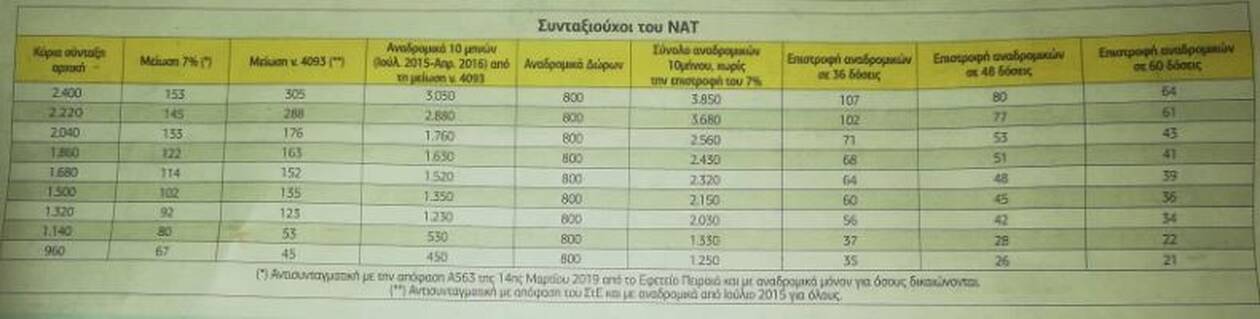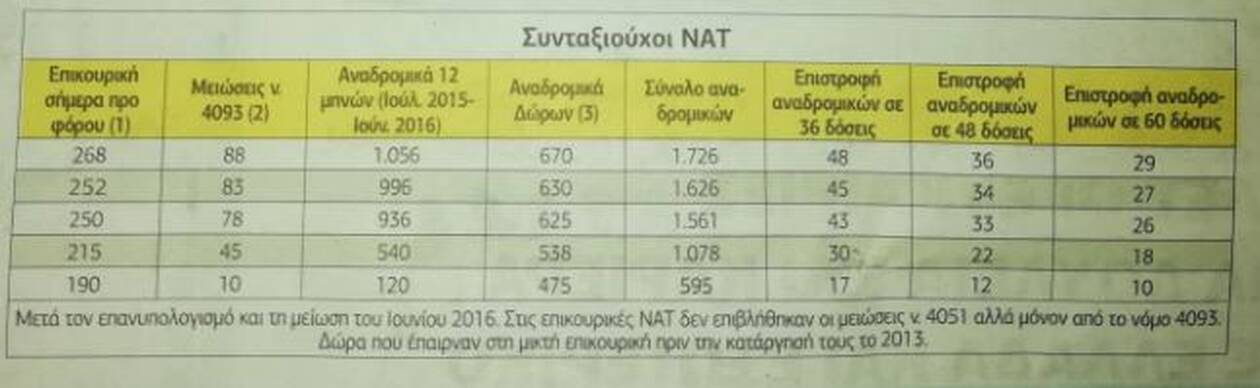 Συνταξιούχοι του ΝΑΤ έχουν λαμβάνειν ως 5.576 ευρώ από παράνομες μειώσεις κύριων και επικουρικών συντάξεων για 10 και 12 μήνες αντίστοιχα. Στο ΝΑΤ επιβλήθηκε μόνον η μείωση του ν. 4093 και αντί για τη μείωση του ν. 4051 επιβλήθηκε μείωση 7% στην κύρια σύνταξη από το πρώτο ευρώ, που προκάλεσε μεγαλύτερη περικοπή. Η μείωση του 7% ωστόσο δεν πήγε στο ΣτΕ για να κριθεί αν είναι αντισυνταγματική, πλην όμως κρίθηκε αντισυνταγματική με τελεσίδικη εφετειακή απόφαση (Α563/2019) και επιστρέφεται μόνον σε όσους προσφύγουν δικαστικά.