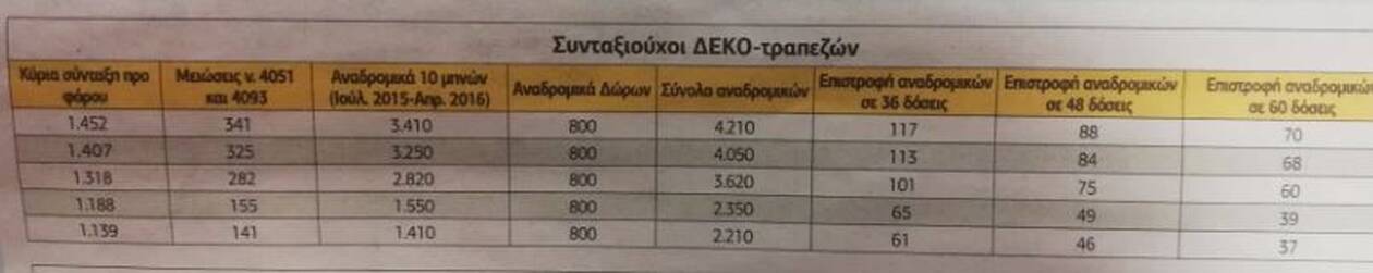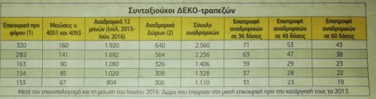 Σύμφωνα με πίνακες συνταξιούχοι των ΔΕΚΟ και τραπεζών έχουν λαμβάνειν ως 6.770 ευρώ από παράνομες μειώσεις κύριων. Αλλά και επικουρικών συντάξεων για 10 και 12 μήνες αντίστοιχα. Με 36 δόσεις θα έχουν μηνιαίες αυξήσεις από 90 ευρώ το μήνα ως και 188 ευρώ το μήνα. Με επιστροφές σε 60 δόσεις, οι μηνιαίες αυξήσεις είναι από 55 ως 113 ευρώ το μήνα.