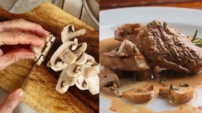 Χοιρινά μπριζολάκια στο τηγάνι με μανιτάρια, κρασί και κρέμα γάλακτος, έτοιμα σε 25 λεπτά