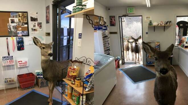 Ατρόμητη ελαφίνα έκανε «ντου» σε μαγαζί για να φάει με τους δικούς της