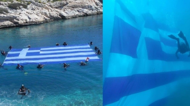 Η μεγαλύτερη ελληνική σημαία καταδύθηκε στην λίμνη Βουλιαγμένης – Βίντεο που προκαλεί δέος και περηφάνια