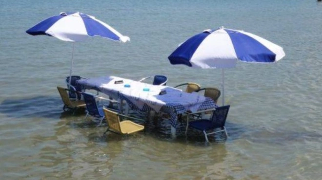 Πολυμήχανος ταβερνιάρης έβαλε τραπέζι στη θάλασσα, για φαγητό στη δροσιά