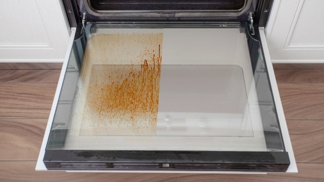 Καθαρίστε την πόρτα του φούρνου από καμένα λίπη και λαδιές με ένα υλικό που έχετε στην κουζίνα σας