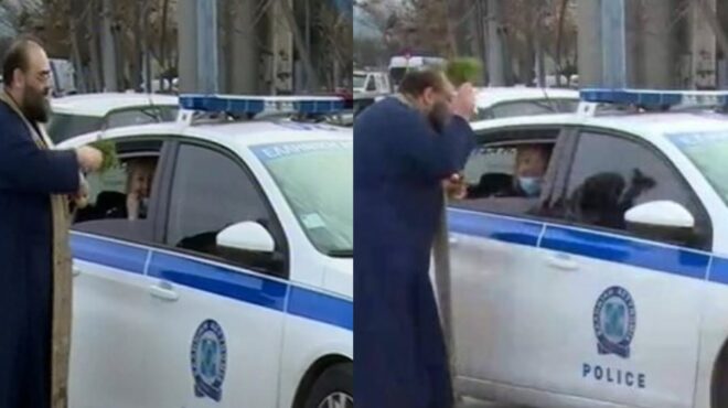 Παπάς φεύγει από την εκκλησία, «αγιάζει» περιπολικά και οι αστυνομικοί βγάζουν μάσκες και του φιλούν το χέρι