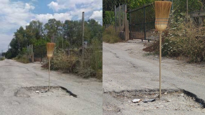 “Ούτε η μάγισσα Ντε Σπελ δεν την απέφυγε”: Τοποθέτησαν σκούπα σε λακκούβα της Πάτρας & τα σχόλια πέφτουν “βροχή”