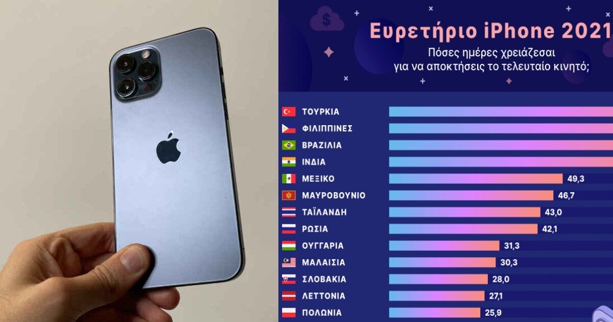 H Ελλάδα βρίσκεται στην 14η θέση του πίνακα, ανάμεσα σε 47 χώρες. Λίγο πιο κάτω από Σλοβακία, Λετονία και Πολωνία και λίγο πάνω από Λιθουανία, Πορτογαλία και Κίνα. Ο Έλληνας πρέπει να δουλέψει κατά μέσο όρο 25,1 ημέρες για να μπορέσει να αποκτήσει το iPhone 13 Pro (128GB). Η τιμή του μοντέλου έχει ανακοινωθεί στα €1179.