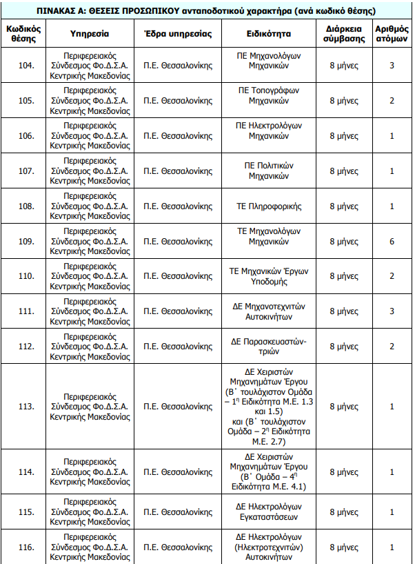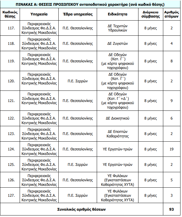 Ανακοίνωση για την πρόσληψη μέσω ΑΣΕΠ, με σύμβαση εργασίας ιδιωτικού δικαίου ορισμένου χρόνου διάρκειας οκτώ (8) μηνών, συνολικά ενενήντα τριών (93) ατόμων σε υπηρεσίες ανταποδοτικού χαρακτήρα του Περιφερειακού Συνδέσμου Διαχείρισης Στερεών Αποβλήτων (Φο.Δ.Σ.Α.) Κεντρικής Μακεδονίας, που εδρεύει στη Θεσσαλονίκη και συγκεκριμένα του εξής, ανά υπηρεσία, έδρα, ειδικότητα και διάρκεια σύμβασης, αριθμού ατόμων (βλ. ΠΙΝΑΚΑ Α), με τα αντίστοιχα απαιτούμενα (τυπικά και τυχόν πρόσθετα) προσόντα