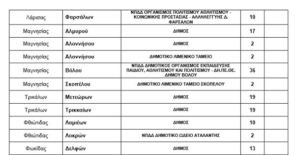 Το υπουργείο Εσωτερικών αποφάσισε τη σύναψη οκτακοσίων σαράντα μίας (841) συμβάσεων ιδιωτικού δικαίου ορισμένου χρόνου για χρονικό διάστημα έως οκτώ (8) μήνες ή έως εννέα (9) μήνες (για απασχόληση σε αναγνωρισμένη σχολή) ή έως έντεκα (11) μήνες για απασχόληση σε παιδικούς – βρεφονηπιακούς σταθμούς, και τη σύναψη πενήντα εννέα (59) συμβάσεων μίσθωσης έργου για χρονικό διάστημα έως ένα (1) έτος, σε ΟΤΑ και ΝΠΔΔ, για τη στελέχωση υπηρεσιών που παρέχουν έργο έναντι αντιτίμου από τις ωφελούμενους, σύμφωνα με τον πίνακα που ακολουθεί: