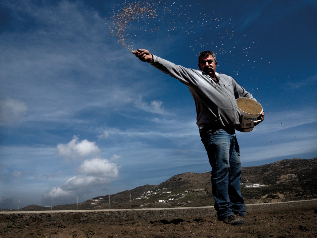 «Ωστόσο σε όσα μέρη επισκεπτόμουν, έψαχνα να βρω πατητήρια και δεν έβρισκα. Τα βρήκα στη Μύκονο. Δεν το πίστευα όταν μου έλεγαν ότι υπάρχουν εδώ. Ο καθένας έχει το δικό του μποστάνι με σταφύλια, το δικό του πατητήρι όπου φτιάχνει το δικό του κρασί. Οι κάτοικοι μαζεύουν τις ελιές τους, σπέρνουν τα χωράφια τους. Θερίζουν. Έχουν μελίσσια και μποστάνια με λαχανικά», λέει ο Βασίλης Βρεττός.
