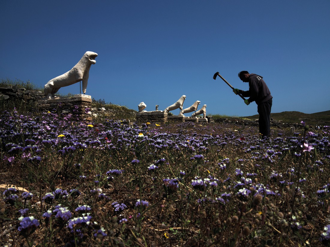 «Στην έκθεση όμως συμμετείχε και η Δήλος. Ένα μέρος με παγκόσμια εμβέλεια. Ένας βαρυσήμαντος αρχαιολογικός χώρος. Πολλοί έρχονται στη Μύκονο και δεν επισκέπτονται τη Δήλο. Δεν τη γνωρίζουν. Είναι σαν να πηγαίνουν στην Αθήνα και να μην επισκέπτονται την Ακρόπολη. Όπως στη Μύκονο, έτσι και στη Δήλο αποτύπωσα τους ανθρώπους. Τους φύλακες, τους καθαριστές, τους αρχαιολόγους. Τους συντηρητές. Μάλιστα πέρσι φωτογράφησα τις ανασκαφές της αρχαιολογικής σχολής στο νησί, την περίοδο που έτυχε να βρίσκονται εκεί οι αρχαιολόγοι. Έχει κι αυτή την καθημερινότητά της και ας μην μένουν μόνιμοι κάτοικοι εκεί. Την επισκεπτόμαστε, βλέπουμε κάτι και δεν ξέρουμε ποιος το συντηρεί, ποιος φροντίζει ώστε να συνεχίσει να υπάρχει μέσα στο χρόνο».