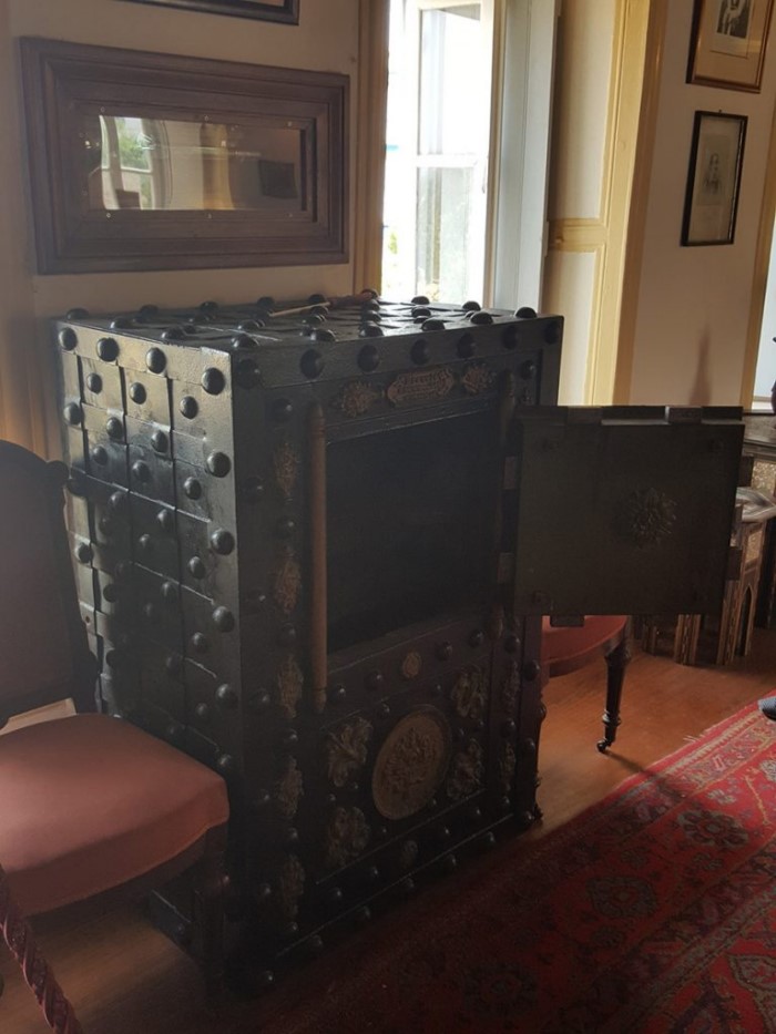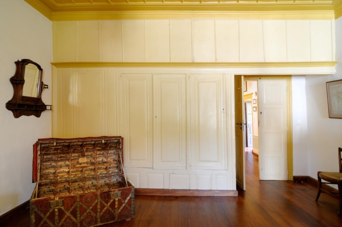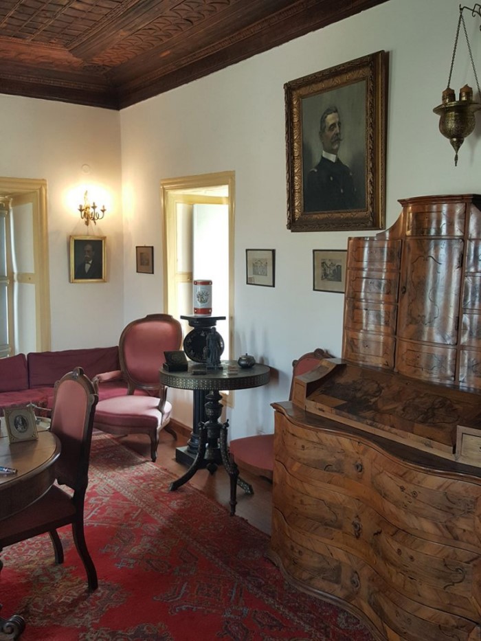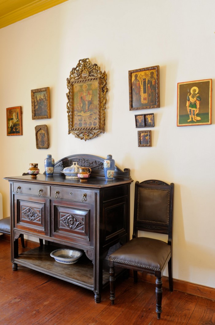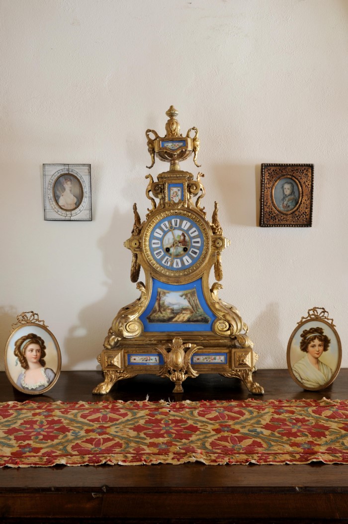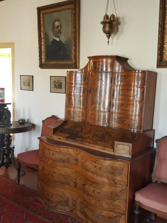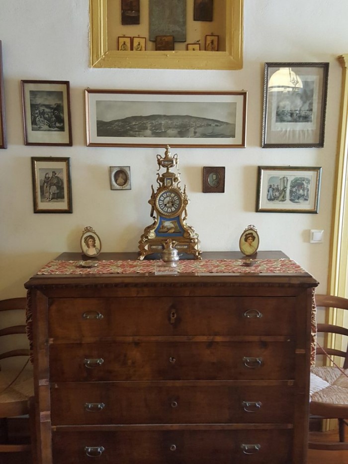Ξεχωρίζουν η νυφική βενετσιάνικη κασέλα. Ένα γαλλικό επίχρυσο ρολόι με πορσελάνη Sevres, γαλλικές μινιατούρες, κεντήματα, τσεβρέδες, χάρτες, αφιερώματα και ελαιογραφίες εποχής.