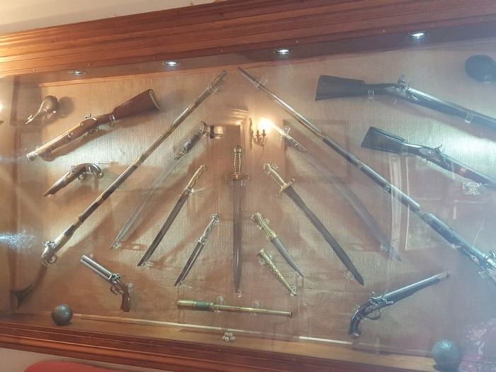 Στη Μεγάλη Σάλα με το πανέμορφο ξυλόγλυπτο ταβάνι Φλωρεντιανής τεχνοτροπίας και την ιταλική-γαλλική του 18ου και 19ου αιώνα επίπλωση, υπάρχει συλλογή όπλων της εποχής του 1821 και μεταξύ αυτών και η πιστόλα της Μπουμπουλίνας.