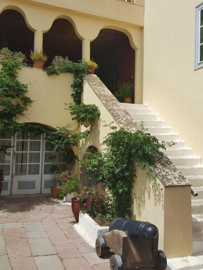 Πέρα όμως από την απερίγραπτη ομορφιά του εσωτερικού χώρου του αρχοντικού, τον επισκέπτη κερδίζει και η παραδοσιακή βοτσαλωτή αυλή των 300 τετραγωνικών μέτρων. Με ελιές, αρωματικά φυτά και λουλούδια, στην οποία φιλοξενείται – τους καλοκαιρινούς μήνες – το Πολιτιστικό Φεστιβάλ του μουσείου. Με πληθώρα εκδηλώσεων, όπως παραδοσιακές ελληνικές μουσικές, χορό, Jazz, κλασσική μουσική, όπερα, θέατρο και άλλα.