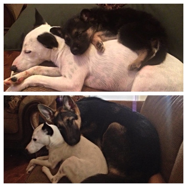 Η λυκοσκυλίτσα αγαπάει τον μεγάλο της αδερφό και ακόμα νομίζει ότι είναι μικρή για να κοιμάται πάνω του