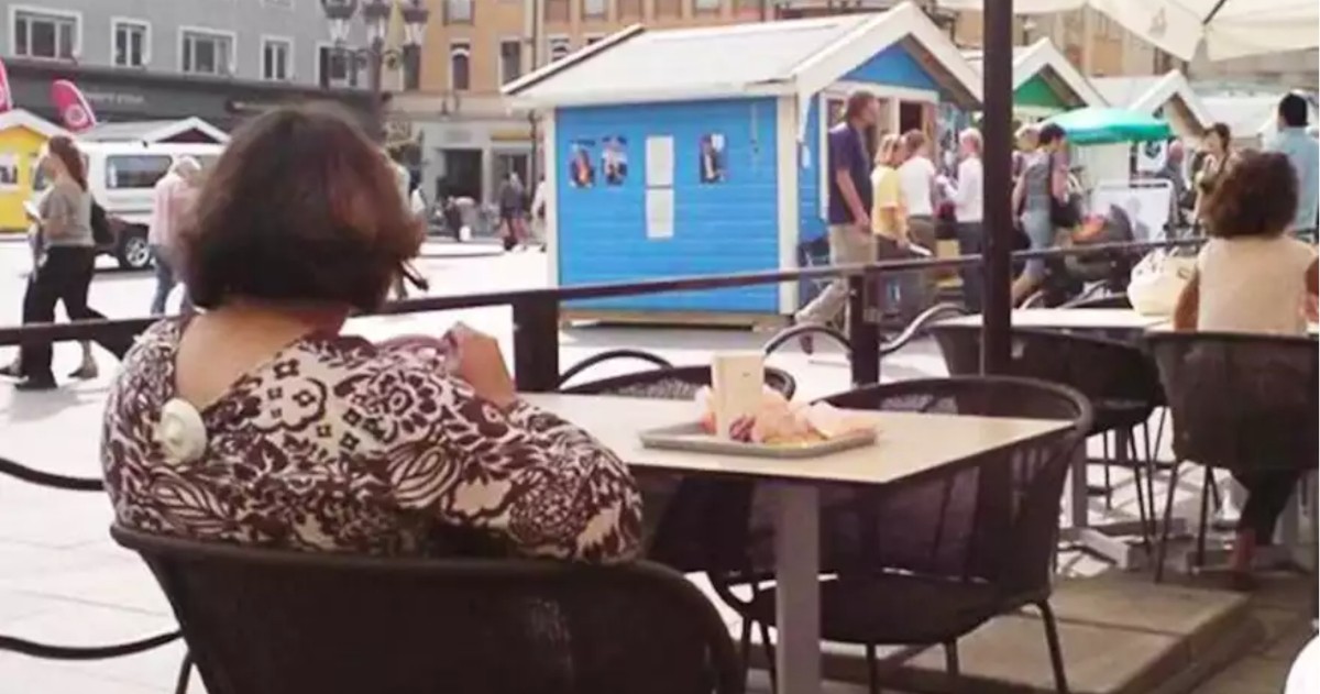 Μία κυρία απολαμβάνει το γεύμα της σε μια υπαίθρια καφετέρια. Γύρω της κόσμος περπατά, τρώει, μιλά.