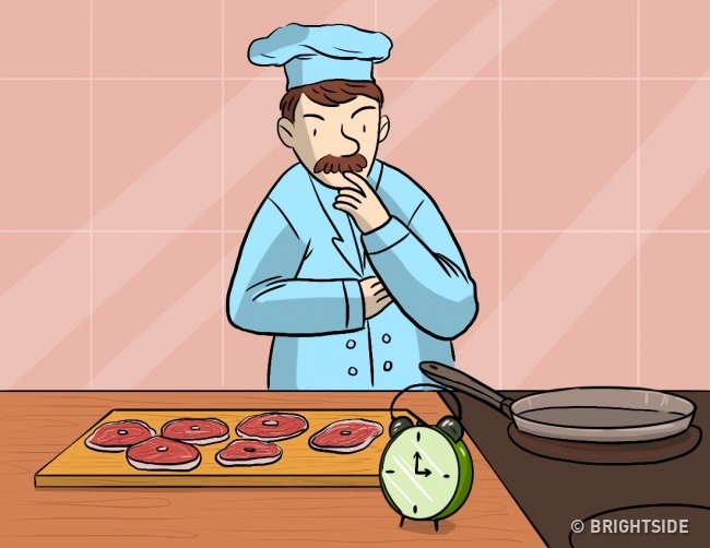 2. Θα βάλει 4 μπριζόλες στο τηγάνι και θα τις τηγανίσει για 5 λεπτά. Μετά από αυτό, θα γυρίσει δύο από αυτές και θα τις αντικαταστήσει τις άλλες δυο με 2 ωμές και θα τις τηγανίσει για 5 λεπτά. Μετά από 5 λεπτά, θα γυρίσει τις 2 μπριζόλες και θα αντικαταστήσει τις 2 έτοιμες με 2 μισοψημένες και θα τις τηγανίσει για 5 λεπτά.