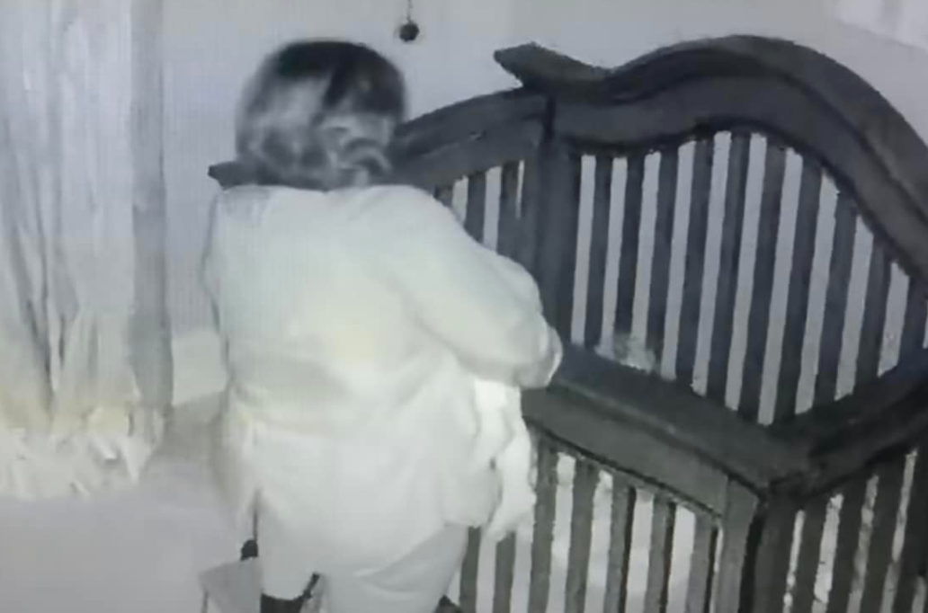 Η κάμερα μέσα στο σπίτι κατέγραψε τη στιγμή που η γιαγιά βάζει το μωρό στην κούνια να κοιμηθεί. Το μωρό κοιμάται ήδη και έτσι κάνει ό,τι μπορεί για να μην ξυπνήσει το μωρό.