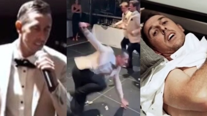 Οι παλμοί ανέβηκαν και λίγα λεπτά αργότερα ο Quinn βρέθηκε πάνω στη σκηνή να χοροπηδάει με τους φίλους του καλυμμένος με χυμένη μπύρα και σαμπάνια. Ο άτυχος γαμπρός γλίστρησε αδέξια, προσγειώθηκε βαριά στο χέρι του και εξάρθρωσε τον αγκώνα του, προκαλώντας ταυτόχρονα ανάμεικτες αντιδράσεις τρόμου και γέλιου στους καλεσμένους.