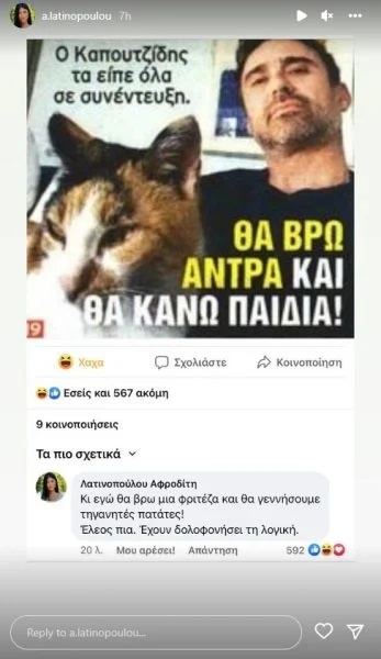 Αυτή τη φορά, η Αφροδίτη Λατινοπούλου αντέδρασε αναρτώντας ένα story στο Instagram, σχολιάζοντας ένα άρθρο που αφορούσε τον Γιώργο Καπουτζίδη. Στη συνέντευξή του, ο Γιώργος Καπουτζίδης είχε δηλώσει χαρακτηριστικά “θα βρω άντρα και θα κάνω παιδιά!” και με βάση αυτό σχολίασε και η νεαρή νομικός.