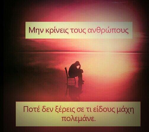 Πριν κατηγορήσεις κάποιον μπες στην δική του αρένα και διάνυσε την δική του πορεία. Μπες στην ύπαρξή του και άδειασέ την. Βίωσε τις δικές του άσχημες εμπειρίες. Αφέσου στα σκοτεινά μονοπάτια των σκέψεών του. Άσε τα σκοτάδια που παλεύει να σε κυριεύσουν. Τους τρόμους που τον καθηλώνουν να σε αναστατώσουν. Τα βάσανά του να σε σημαδέψουν. Κοίτα πως μαζεύει κάθε φορά τα θρύψαλα της ψυχής του.