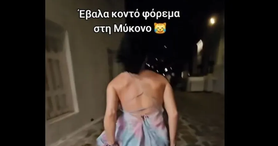 Στο βίντεο που έγινε viral, γυναίκα που βρίσκεται στο νησί περπατάει σε ένα από τα χαρακτηριστικά δρομάκια του, τραβώντας συνεχώς το φόρεμά της προς τα κάτω, για να μην της το σηκώσει ο ισχυρός άνεμος, με τους χρήστες να σχολιάζουν ότι στη Μύκονο «φυσάει μόνο δύο φορές τον χρόνο… και η μία κρατάει έξι μήνες!».