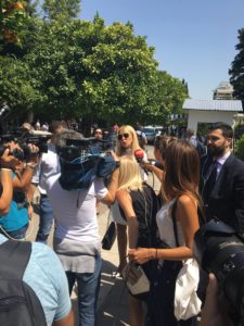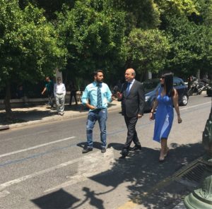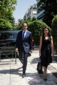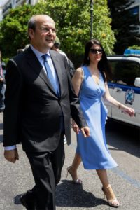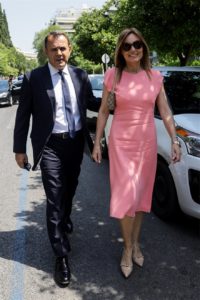Γαλάζιο φόρεμα επέλεξε η Ευγενία Μανωλίδου, σύζυγος του Αδωνι Γεωργιάδη, η οποία περιτριγυρίστηκε από κάμερες αλλά θέλησε μόνο να ευχηθεί καλή επιτυχία στη νέα κυβέρνηση.