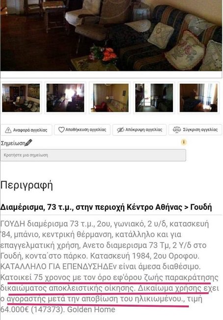 Μέχρι εδώ, όλα καλά. Το παράδοξο στη συγκεκριμένη αγγελία είναι ότι αναφέρει πως σε αυτό το σπίτι κατοικεί 75χρονος. Ωστόσο, ο ηλικιωμένος κύριος έχει θέσει όρο παρακράτησης δικαιώματας αποκλειστικής οίκησης. Δηλαδή, ακόμη κι αν κάποιος το αγοράσει, δεν θα έχει δικαίωμα να το χρησιμοποιήσει. Για να κάνει χρήση της αγοράς του, θα πρέπει πρώτα να «φύγει» ο 75χρονος άνδρας και έπειτα να περάσει η χρήση της οικίας στα δικά του χέρια. Πρωτοφανές και παράδοξο γεγονός, το οποίο όμως είναι αληθινό και συμβαίνει στην Ελλάδα. Μπορεί κάποιοι να έχουν δει κάτι αντίστοιχο να συμβαίνει. Όμως, σίγουρα δεν θα μιλούσαν για κάποιο πραγματικό γεγονός. Ίσως να επρόκειτο για κάποια κωμική ταινία. Εδώ, όμως, μιλάμε για πραγματικότητα…