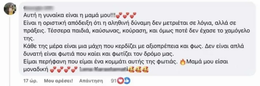 «Αυτή η γυναίκα είναι η μαμά μου! Είναι η οριστική απόδειξη ότι η αληθινή δύναμη δεν μετριέται σε λόγια, αλλά σε πράξεις. Τέσσερα παιδιά, καύσωνας, κούραση, κι όμως ποτέ δεν έχασε το χαμόγελό της».