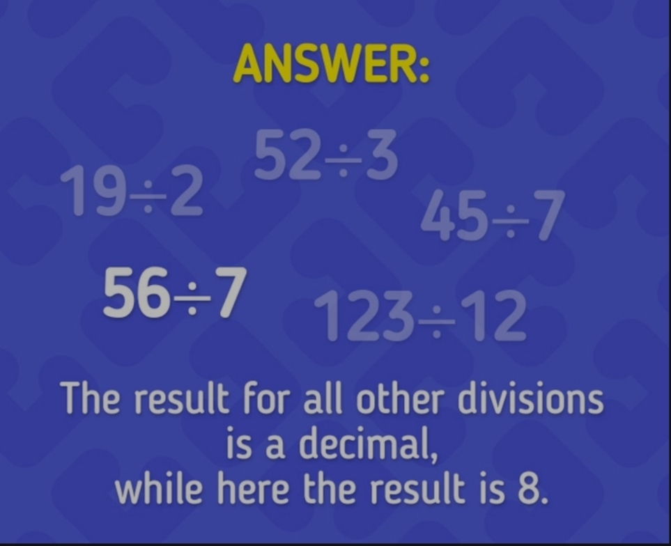 *Τα αποτελέσματα όλων των άλλων διαιρέσεων είναι δεκαδικό, εκτός από την διαίρεση 56:7 που το αποτέλεσμα είναι 8.