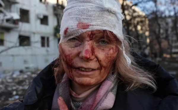 Η τραυματισμένη γυναίκα εμφανίζεται καθώς αεροπορικές επιδρομές κατέστρεψαν ένα συγκρότημα διαμερισμάτων έξω από το Χάρκοβο της Ουκρανίας, στις 24 Φεβρουαρίου. Η επίθεση ξεκίνησε τις πρώτες πρωινές ώρες αφότου ο Ρώσος πρόεδρος Βλαντίμερ Πούτιν κήρυξε την έναρξη μιας «ειδικής στρατιωτικής επιχείρησης».