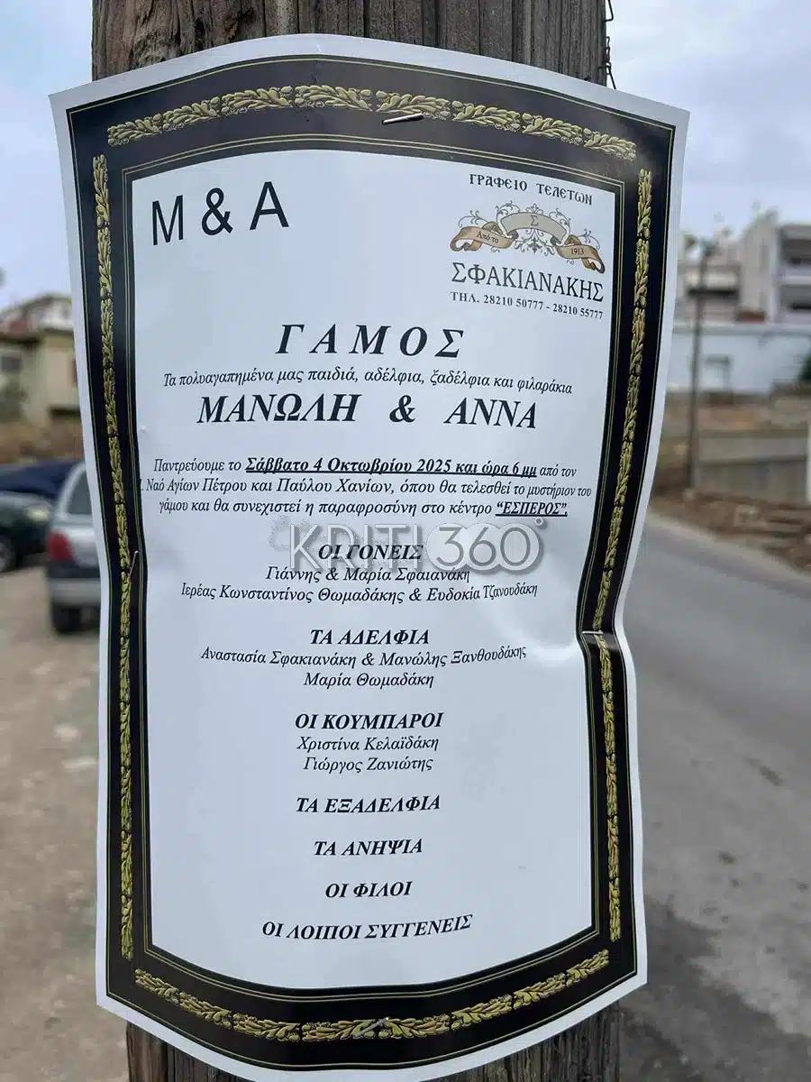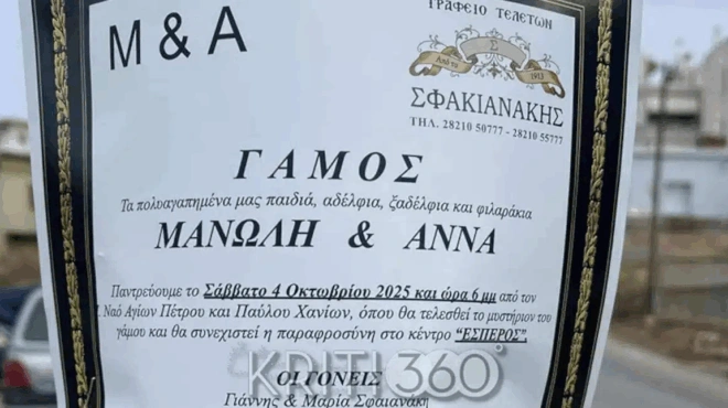 Με μοναδικό χιούμορ και αυτοσαρκασμό, το γραφείο τελετών Σφακιανάκη στα Χανιά απέδειξε για ακόμη μια φορά ότι ξέρει πώς να τραβά τα βλέμματα — αυτή τη φορά όχι με κάποια πρωτότυπη διαφήμιση, αλλά με το… αγγελτήριο γάμου του γιου του ιδιοκτήτη.