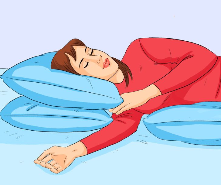 Εάν πονάνε οι ώμοι σας και το να κοιμάστε ανάσκελα ή μπρούμητα δεν είναι άνετο για εσάς, δοκιμάστε το παρακάτω κόλπο. Δεν χρειάζεται να αγοράσετε καμία ειδική συσκευή, απλώς αποκτήστε πιο ποιοτικά μαξιλάρια και δημιουργήστε με αυτά ένα κανάλι για το χέρι σας, όπως φαίνεται στην εικόνα. Μην βάλετε τα μαξιλάρια πολύ ψηλά στο πλάι σας. Κρατήστε τη σπονδυλική σας στήλη ευθυγραμμισμένη.