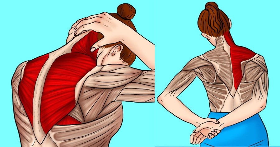 Αυτό το τέντωμα απελευθερώνει την ένταση στην άνω πλάτη και μεταξύ των ωμοπλάτων. Όλες οι κινήσεις πρέπει να είναι ομαλές και απαλές.