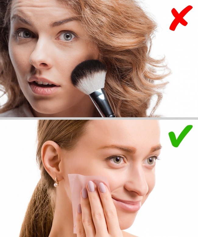 Η ζώνη T σας γυαλίζει; Ας την πουδράρουμε! Μην το κάνετε αυτό, ανήκει στις λάθος συνήθειες εκτός αν θέλετε τους πόρους σας να φράξουν και τα σπυράκια σας να εμφανίζονται πιο συχνά. Πρώτον, είναι απαραίτητο να αφαιρέσετε τυχαία πλεονάζουσα λιπαρότητα με ειδικό χαρτί και μόνο τότε μπορείτε να αρχίσετε να εφαρμόζετε την πούδρα.