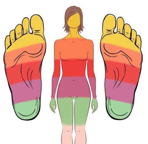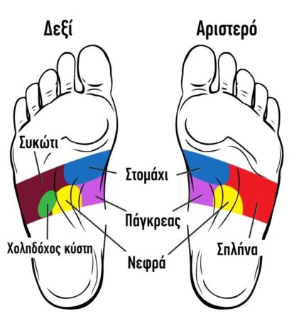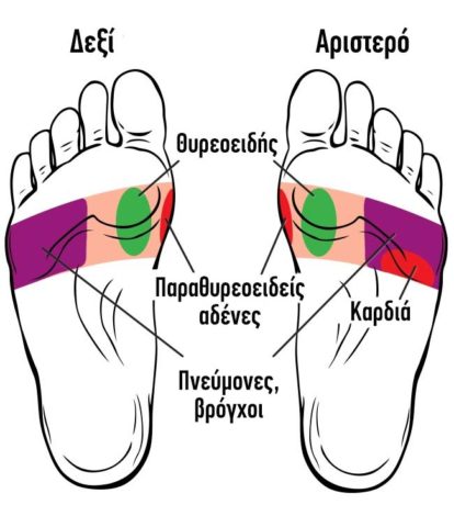 Και το αριστερό και το δεξί πόδι, χωρίζονται σε 5 ζώνες που σχηματίζονται από 4 γραμμές. Κάθε ζώνη ανταποκρίνεται σε μια συγκεκριμένη περιοχή του σώματος και τα όργανα που υπάρχουν εκεί.