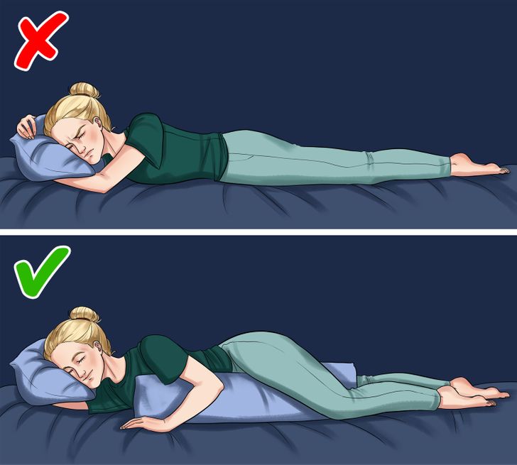 Θα ήταν πολύ πιο χρήσιμο να κοιμάστε στο πλάι εάν χρησιμοποιείτε ένα επιπλέον μαξιλάρι. Ίσως έχετε δει αυτά τα ειδικά μαξιλάρια για έγκυες γυναίκες. Δημιουργούν πρόσθετη υποστήριξη για το σώμα, ελαττώνοντας έτσι την πίεση από τους γοφούς και τη μέση. Αυτό η επίδραση μπορεί να εφαρμοστεί από όλους. Το μαξιλάρι γεμίζει το χώρο μεταξύ του σώματος και του στρώματος αποκαθιστώντας τη φυσική θέση της σπονδυλικής στήλης.