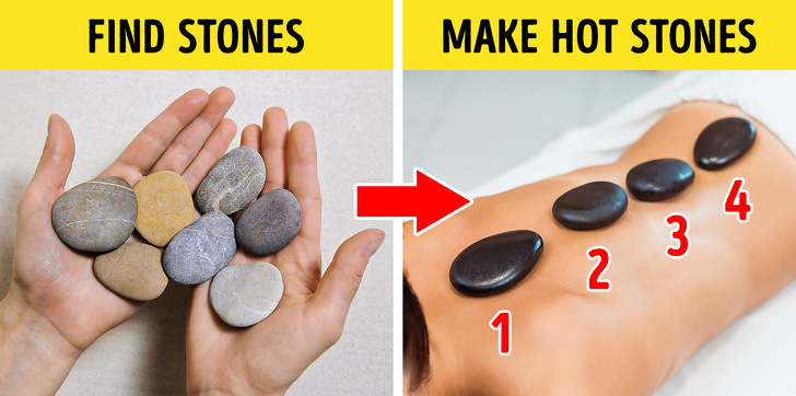 Μπορείτε να βρείτε μόνοι σας πέτρες και να χαλαρώσετε την πλάτη σας στο σπίτι. Για παράδειγμα, μπορείτε να τις βρείτε δίπλα στη θάλασσα ή να τις αγοράσετε σε κατάστημα. Η μόνη απαίτηση είναι ότι πρέπει να είναι στρογγυλές. Τοποθετώντας τις θερμαινόμενες πέτρες πάνω από σημεία πιεσοθεραπείας μπορείτε να απαλλαγείτε από την ένταση στο σώμα σας και να επιταχύνετε την διαδικασία επούλωσης του σώματος. Είναι πάντα καλύτερο να συμβουλευτείτε τον γιατρό σας, ο οποίος μπορεί επίσης να σας συμβουλεύσει πού να τις εφαρμόσετε.