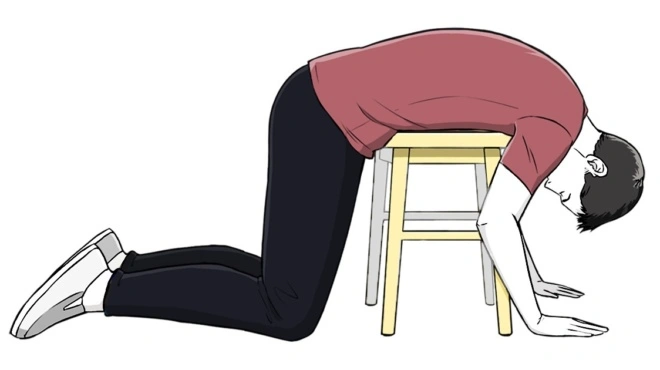 Απλά χρειάζεστε ένα μαλακό μαξιλάρι και μια καρέκλα ή σκαμνί. Καθίστε στα γόνατά σας και τοποθετήστε το σώμα σας πάνω από το κάθισμα της καρέκλας. Χαλαρώστε ολόκληρο το σώμα σας και αφήστε τη σπονδυλική στήλη σας να κυρτώσει. Το κεφάλι σας πρέπει να είναι χαμηλωμένο. Μείνετε έτσι μέχρι να αισθανθείτε ανακούφιση στους μυς σας.