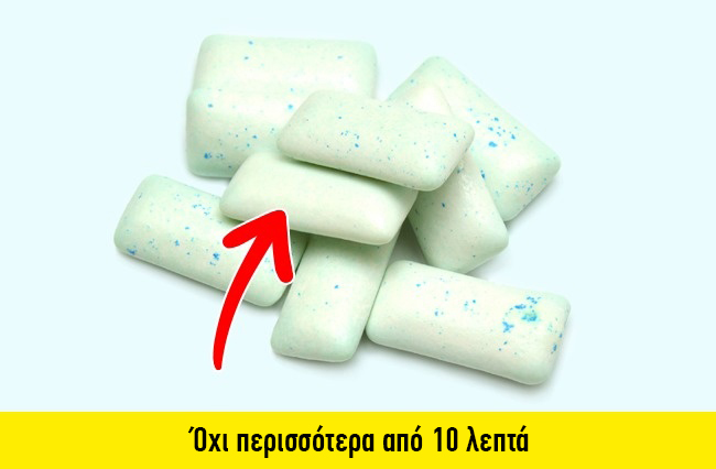 Συμβουλή: Οι τσίχλες που περιέχουν φυσικά γλυκαντικά (ξυλιτόλη, σορβιτόλη) είναι λιγότερο επιβλαβείς από εκείνες με ζάχαρη, κυκλαμικό άλας ή ασπαρτάμη. Αποφύγετε να μασάτε τσίχλα για περισσότερο από 10 λεπτά, ακόμα και με γεμάτο στομάχι.