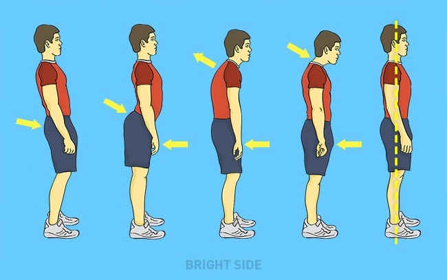 Σωστή στάση: Προσπαθήστε να μην σκύβετε και να κάθεστε σωστά, με την πλάτη ίσια, τα πόδια στο πλάτος των ώμων, ελαφρώς προς τα μπροστά και με τους ώμους πίσω. Αυτή είναι η βέλτιστη θέση για την σπονδυλική στήλη ώστε να κρατήσετε σωστά το σώμα. Μην βάζετε τα χέρια στην τσέπη μιας και αυτό θα σας κάνει να σκύψετε.